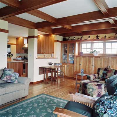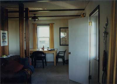 Private Residence Transformation, Bayfield, WI Project Description All Photos This photo shows the coffered beamed ceiling which eliminated the need for the two columns in the middle of the room shown in the before photo (bottom photo). On the wall opposite the fireplace there are built in cherry cabinets with three small squat windows above capped with a continuous shelf above. The pass through window again opens up the living and kitchen spaces and allows for views through the living space out to the water. |