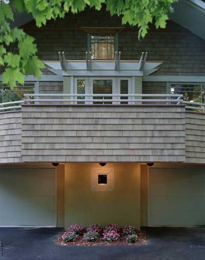 The south facing deck is used to strengthen the horizontal line of the tall wall. It also provides a strong shadow which helps to reduce the visual impact of the garage doors.
