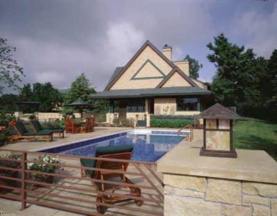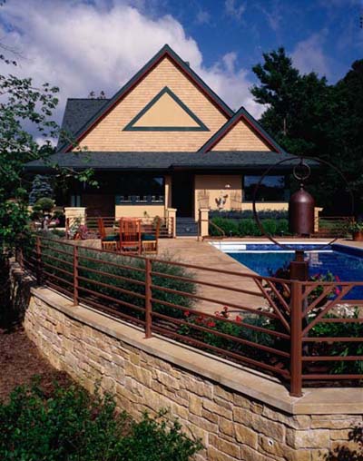 Private Residence, Eau Claire, WI Project Description Photos The pool is elevated from the front yard removing this active area from view, yet allows the pool and deck to have great south light and unbroken views to the pond and woodland beyond. The guest parking and main entrance sidewalk are flanked by an arbor-covered reflecting pool with large copper water spouts projecting from a stucco and limestone garden wall (see top left of horizontal photo). |