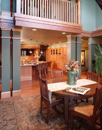 Private Residence, Eau Claire, WI Project Description Photos The breakfast room is the heart of the main floor. The design allows south light to penetrate into the house on both levels. The horizontal banding provides counterpoint to the vertical space and integrates with each of the adjoining rooms. The fireplace is surrounded by custom made tiles and the leather covered period desk sits before art glass windows- (See next photo) |