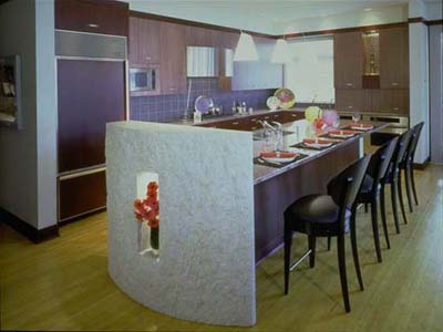 Private Residence, Grays Bay, Wayzata, MN Project Description Photos The kitchen is open to the family room and breakfast area as well as providing panoramic views of the wooded outdoors are available from the center island. The large limestone block with display niches provides a visual screen and focal point for views from the gallery. |
