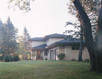 Lakeside Residence Project Description All Photos This exterior photo of the entrance shows the blend of two different shades of acrylic stucco, and the continuous trim band that circles around the entire house. The brick paved driveway extends up the steps t the front door as shown. |