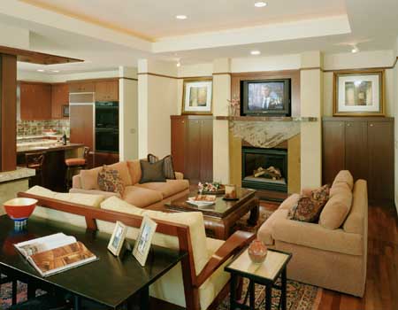 The fireplace with TV above incorporates three different kinds of granite, and is flanked on either side by cabinets and art niches.
