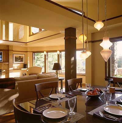 The dining room is open to the great room and the sweeping views beyond, while interior columns and soffit help to denote the space.