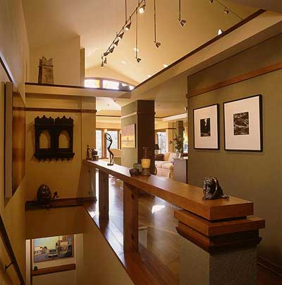 The entry is part of a vaulted gallery space, and well as longer views through the house to the living spaces beyond. The floating wood stair rail provides a beautiful ledge for sculpture, and the glass panels below let ample light and views filter through. |