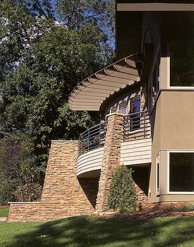 The delicate custom metal and wood railing contrasts nicely with the masonry piers, which anchor the home to its sloping site.