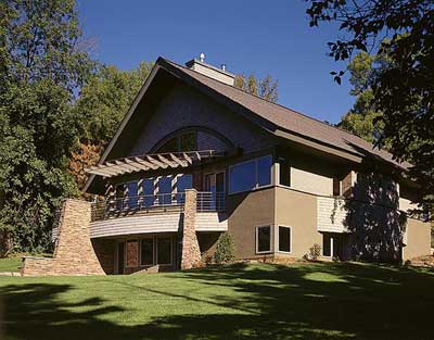 The curved glass wall in the great room adds interest to the rear façade. The curve is continued through the arc of the master bath bay with its five high windows surrounding the tub. The curved theme is also seen in elevation in the arched transom. Exterior finishes of stucco, cedar siding, cedar shingles, and masonry all blend well together. |