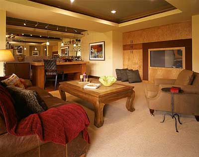 The lower level theater space features a tray ceiling with indirect lighting. The bar area connected, yet off to one side, has a mirrored back wall and glass display shelves to allow more light to filter in. The bar itself, has a floating wood slab counter allowing the floor material to go through and gives it a more open feel. |