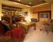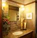 The powder room features granite counter and backsplash in rich colors, and complimentary faux painted walls, which add depth and interest. |