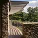The delicate custom metal and wood railing contrasts nicely with the masonry piers, which anchor the home to its sloping site. |