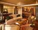 The lower level theater space features a tray ceiling with indirect lighting. The bar area connected, yet off to one side, has a mirrored back wall and glass display shelves to allow more light to filter in. The bar itself, has a floating wood slab counter allowing the floor material to go through and gives it a more open feel. |