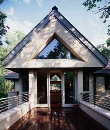 This residence has an open great room in cruciform plan, consisting of living room, dining room, and kitchen. The intersection of these spaces creates a focal point for the piano from which you can also see the gallery. The two intersecting vaults with large trapezoidal windows allow light and views from every room, while the perimeter soffits soften the vertical scale of the rooms and permit gallery quality lighting for the art collection. Materials include, Sapele hardwood floors, mahogany doors, and mahogany and birds eye maple cabinetry. Exterior materials are Chilton limestone and stucco.