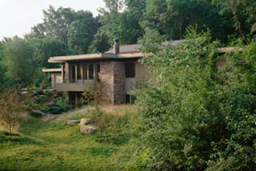 This residence was designed on a long thin lot with streets on three sides. The lot had a group of beautiful mature trees at the west end and was open rolling grassland over the balance of the lot. Our clients were a professional couple with no children. They required office and storage space and display areas for a collection of art. Our design goals included creating a very open plan with most living space on the main floor. A guest bedroom, studio, craft shop, and office were located in the lower level. The floor plan and fenestration were designed to minimize certain site-related privacy issues and at the same time take advantage of available sun angles, long views to a city nature park, and the existing trees to the west. The design permitted the use of large window areas for private views into gardens, woodland, and park, but used overlapping walls and vegetation in strategic areas to provide screening from vehicular traffic at the street corner. There is a hill planted with large white pines surrounding a neighboring house located just to the south of this lot. These trees greatly reduced the available natural southerly sunlight and the location of the adjacent house created a visual privacy concern. Our design solution uses a central vaulted clerestory that provides natural light from all direction without sacrificing privacy. The selection of materials help to anchor the home to the site. Stucco and limestone are used both inside and out and add a depth of texture in contrast to the polished wood and granite interior finishes. |