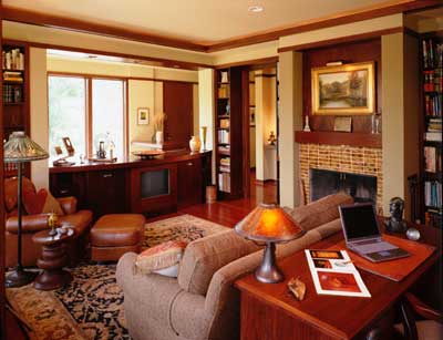 View of library looking east into entry and stairway with views to park beyond.