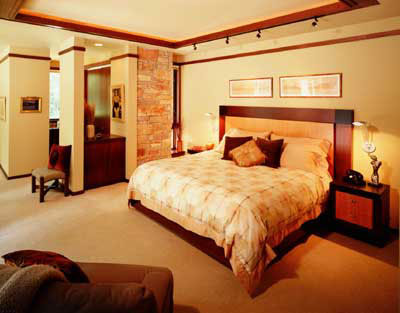 Bedroom with custom designed bed and end tables. The limestone wall is a continuation of the exterior wall seen in photo 4.