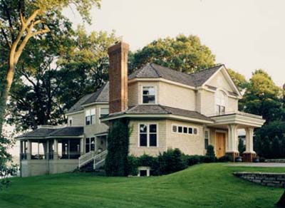 More Examples Photos This project is an addition and extensive remodel of a home built in 1905. The portico, entry, and octagonal room at the front along with the porch seen in the rear left are new construction. The revised floor plan provided better circulation and a greatly improved view of the lake. Work included new fireplaces and new chimneys, all new fenestration, siding and a concealed deck off the master bedroom that is built into the porch roof. |