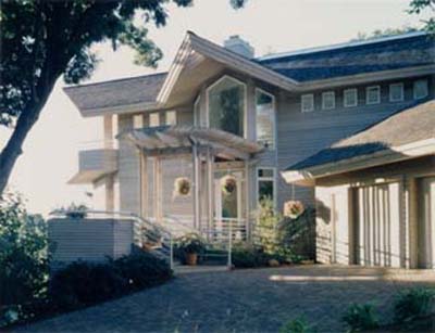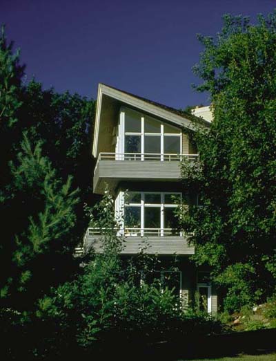 More Examples Photos This home was designed for an extremely challenging lot on one of the highest points in Minnetonka, Minnesota. The plan accommodates over twenty vertical feet of slope within the width of the house and preserves the woodland canopy. The entry is reached by an arbor covered bridge and views as far away as St. Paul are visible through the glass curtain walls in the living room, master bedroom, and from their cantilevered decks. The gallery features a forty foot long skylight at the roof ridge which leads to the door of the master suite which is built into the chimneys. |