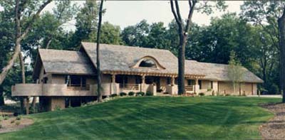 More Examples Photos This design is a modern interpretation of the bungalow style. The site presented a challenge as it was surrounded by a U-shaped street on three sides resulting in a situation where the best views were to the lake while the best light was toward the street. By incorporating the large wraparound deck with solid walls and then cutting away the walls and inserting copper rails at specific angles, it was possible to provide screening from the street and preserve the views to the lake. The large copper clad eyebrow dormer brings light into the living space through a barrel vault. |