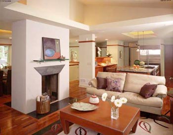 The homes floor plan allows for entertaining many guests yet also creates special, private spaces. A generous kitchen surrounds a large granite-topped island, while a nearby built-in desk provides space for letter writing and cookbooks. The adjoining living and dining rooms are anchored by an island fireplace of granite and stucco.