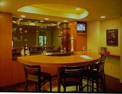 Private Residence, Shorewood, MN Project Description Photos An open floor plan allows the home owners and their guests to share views to the fireplace and deck while enjoying company in the kitchen, living room or library-media nook beyond. The bar features a horseshoe shaped mahogany top resting on lacquered steel legs. The shape of the bar is repeated in the ceiling soffit and on the acid etched concrete floor. |