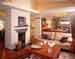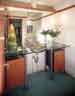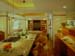 An open floor plan allows the home owners and their guests to share views to the fireplace and deck while enjoying company in the kitchen, living room or library-media nook beyond. The bar features a horseshoe shaped mahogany top resting on lacquered steel legs. The shape of the bar is repeated in the ceiling soffit and on the acid etched concrete floor. |