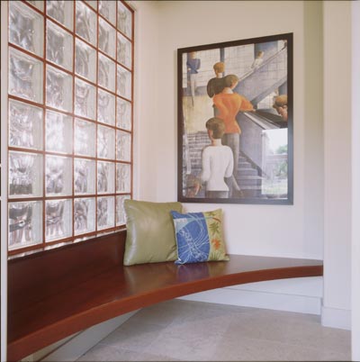 Urban Prairie House, Minneapolis, MN Project Description Photos The Foyers seating area and coatroom gathers daylight through a glass block window common to the Great Room and features a window view to the prairie. The curved mahogany seat matches the cabinet wood and reflects curves of a soffit beyond. Stone flooring continues through adjacent rooms to simplify and bind their character. |