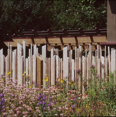Urban Prairie House, Minneapolis, MN Project Description Photos An architecturally designed fence is a response to the varying textures of the prairie that it surrounds. The Arbor beyond and fence screen and shade an outdoor patio. The outdoor setting includes custom steel arbor columns enclosing a seating and hot tub area on rustic concrete pavers. Each bedroom offers private access to the patio. |